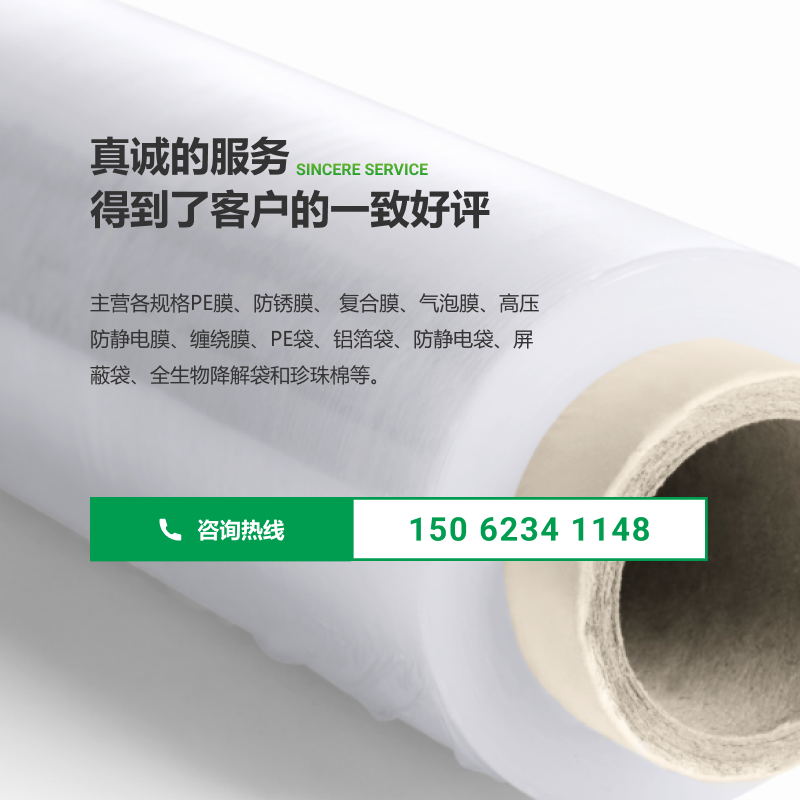 公司主營(yíng)生產(chǎn)、銷(xiāo)售:各種類(lèi)PE膜、高壓防銹膜、高壓防靜電膜、纏繞膜、氣泡膜;各類(lèi)PE平口袋、PE方底袋、鋁塑方底袋、防銹袋、防靜電袋、屏蔽袋、氣泡袋、印刷袋以及全生物降解袋等。